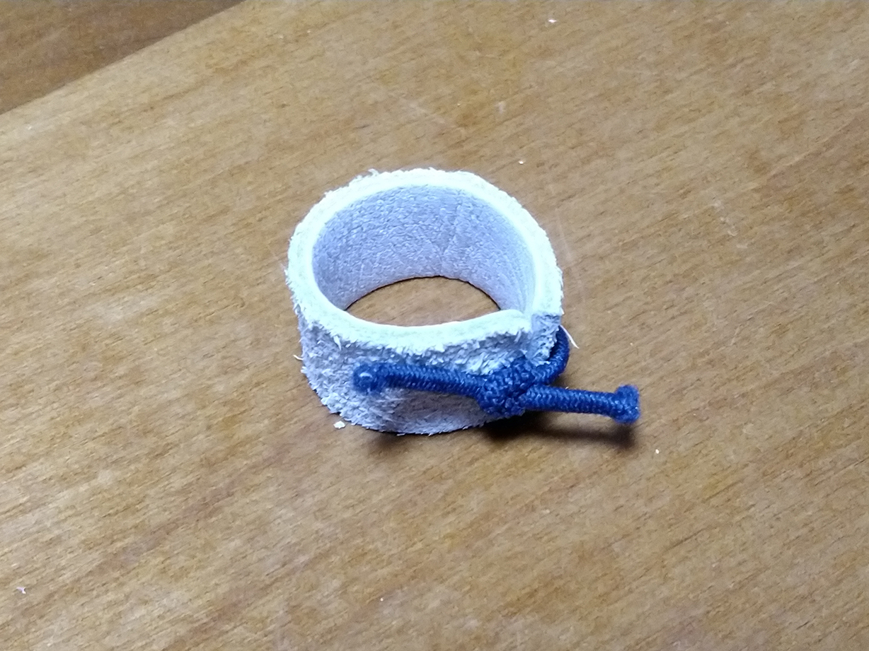 写真の「指抜き5点入」に入っている左の白い革製ので作ってみました。 千枚通しで両端に穴を開け、ゴム紐が通るくらいの大きさまで広げて、ゴム紐を通して縛って完成。